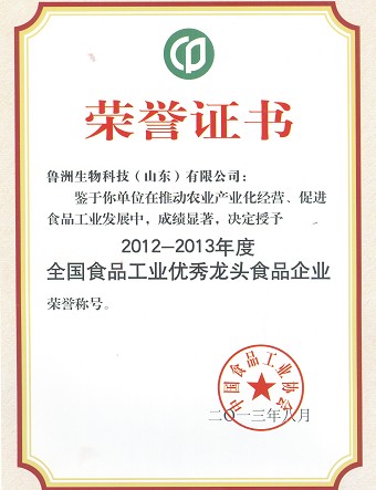 近日,中國食品工業協會召開表彰2012——2013年度全國食品工業強縣(市、區)和優秀龍頭食品企業大會,魯洲生物科技(山東)有限公司,被授予“全國食品工業優秀龍頭食品企業”榮譽稱號。